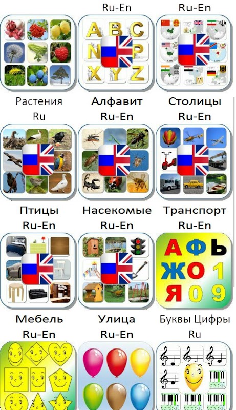 Пособие представляет собой электронное приложение в виде наборов озвученных карточек по разным темам. Каждый набор можно скачать отдельно. После запуска приложения на экране в случайном порядке появляются изображения. При нажатии на изображение произносится название изображенного на картинке на английском языке и подписи на русском и английском языках. Во всех приложениях проговариваются более 60-ти поощрительных фраз на русском языке. Все приложения бесплатные.