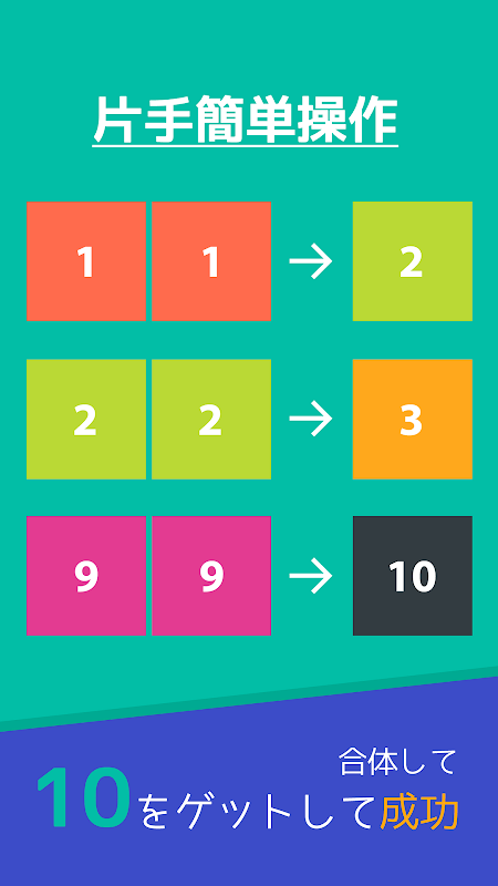 隣り合う同じ数字ブロックパネルをタッチして合体してどんどん大きな数字を作っていく、10に達成できたら成功です。