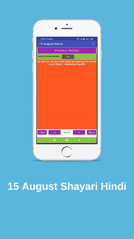 इस ऐप के अंदर आपको 15 अगस्त की बेहतरीन शायरी और भाषण हिंदी में मिलेंगे। इस ऐप में 15 अगस्त की स्थिति का सबसे अच्छा संग्रह है। आप इस ऐप में स्टेटस को फेसबुक या व्हाट्स-ऐप पर भी साझा कर सकते हैं। उपयोगकर्ता व्हाट्स-ऐप, फेसबुक और अन्य सोशल मीडिया प्लेटफ़ॉर्म पर अपनी स्थिति को दैनिक रूप से सेट कर सकते हैं। एप्लिकेशन में सर्वश्रेष्ठ और नवीनतम शायरी, स्थिति और संदेश शामिल हैं