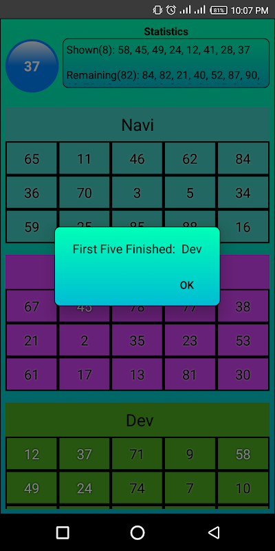 In this game each sheet will allocate for each player. And each sheet contains 15 numbers. A dice is placed on top of the sheets. There are 90 numbers (1-90) in the dice. When you clicked on the dice, the result number will be checked throwout the players sheets whether that number is in his/her sheet. If found white color applied to the number in the sheet. In this way who completes the complete sheet are winners. More info can be found in game's main screen.