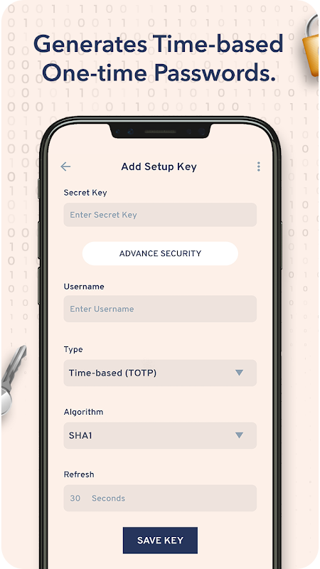 • ऐप प्रत्येक ३० सेकंड के बाद नए टोकन उत्पन्न करता है (डिफ़ॉल्ट रूप से या उपयोगकर्ता विशिष्ट समय के अनुसार)।