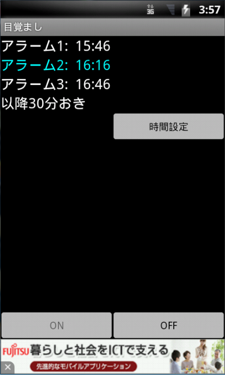 ・設定するのは1つの時間のみです。例えば朝6時に設定した場合、まず5時30分に警告として1回、その後実際に起きる為に6時に1回、その後もし寝過ごした場合を考え30分おきに(アプリを起動してOFFにしない限り)鳴り続けます。