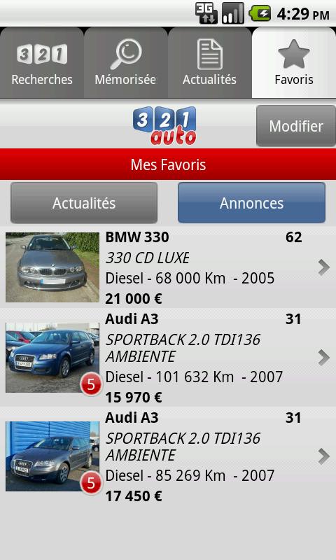 L’application 321auto vous permet de trouver la voiture de vos rêves parmi un large choix de véhicules d’occasion. Spécifiez votre recherche et consultez des dizaines de milliers d’annonces à côté de chez vous !