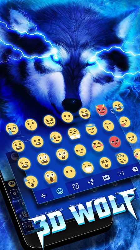 3D Wolf Keyboard Theme & Blue Lightning Keyboard is a free extension customized for Facemoji Emoji Keyboard app. It has an emoji keyboard for Android phones which is free (With 3500+ emoji & emoticons, smileys, funny stickers, emoji fonts, colorful and customizable themes, GIFs and more).