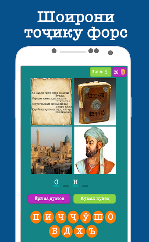 Дар ин бозии Шоирон, мо дар хар зина 4 акс (сурат) нишон медихем ба 1 шоири адабиёти классики форсу точик алокае дорад. Шумо бояд он Шоирро дарёфт кунед! Бо ин бози шумо на танхо вакти холии худро хуш мегузаред, балки метавонед дониши худро низ завкал дихед!
