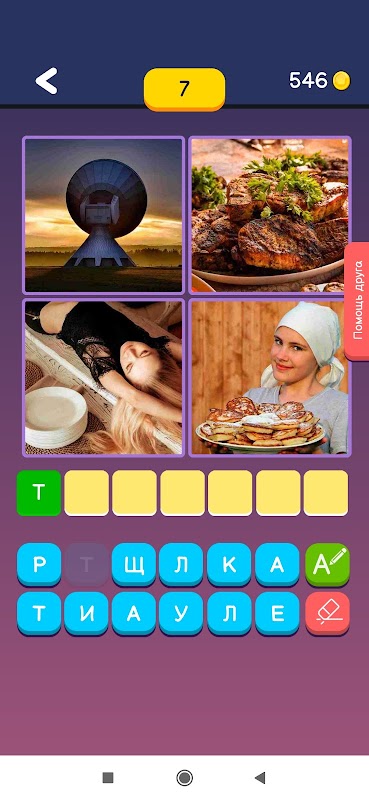 चित्रों में छिपे शब्द का अनुमान लगाएं। प्रत्येक स्तर पर बहुत सरल नियम 4 चित्र हैं, संयुक्त, एक शब्द में, चित्रों के नीचे के अक्षरों से। इस खेल को 4 चित्रों 1 शब्द के रूप में भी जाना जाता है। नियंत्रण स्पर्श द्वारा है।