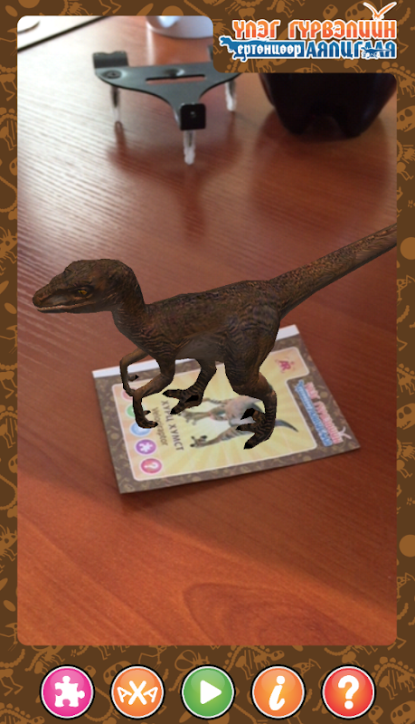 Энэхүү “Үлэг гүрвэлийн ертөнцөөр аялцгаая” ухаалаг карт нь бодитоор харах боломжгүй эртний үлэг гүрвэлүүдийг 3 хэмжээст хөдөлгөөнт дүрслэлээр харуулж ид шидийн мэт ертөнцөөр аялуулахаас гадна мэдлэг шалгах АХА тоглоом, сэтгэхүй хөгжүүлэх эвлүүлдэг тоглоом зэргийг багтаасан.