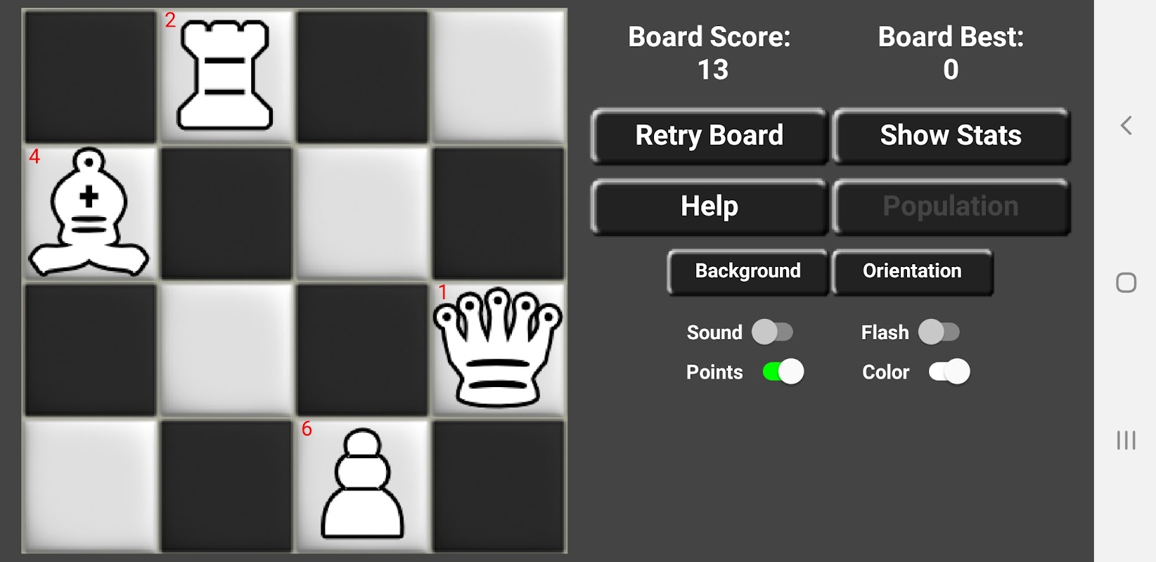 यदि आप किसी बोर्ड पर अटक जाते हैं, तो आप पॉपुलेट का चयन करके और अपना मनचाहा बोर्ड चुनकर किसी अन्य कॉन्फ़िगरेशन का अनुरोध कर सकते हैं। आप वॉल्यूम और बैकफ़्लैश को चालू या बंद कर सकते हैं। आप काले या सफ़ेद मोहरे भी चुन सकते हैं।