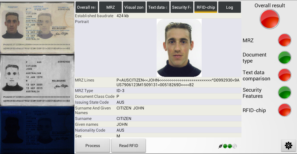 डेमो आवेदन मोबाइल दस्तावेज़ पाठक Regula 7308 के साथ उपयोग करने के लिए