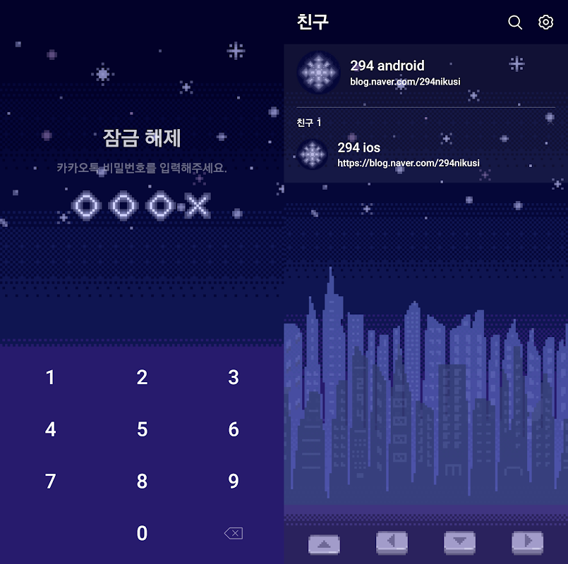 도트 그래픽 감성의 밤하늘 카카오톡 테마입니다.