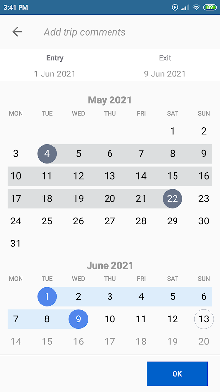 ■ अपनी चल रही यात्रा के लिए अनुमत दिनों की उलटी गिनती का निरीक्षण करें (यदि निकास तिथि खाली छोड़ दी गई है),