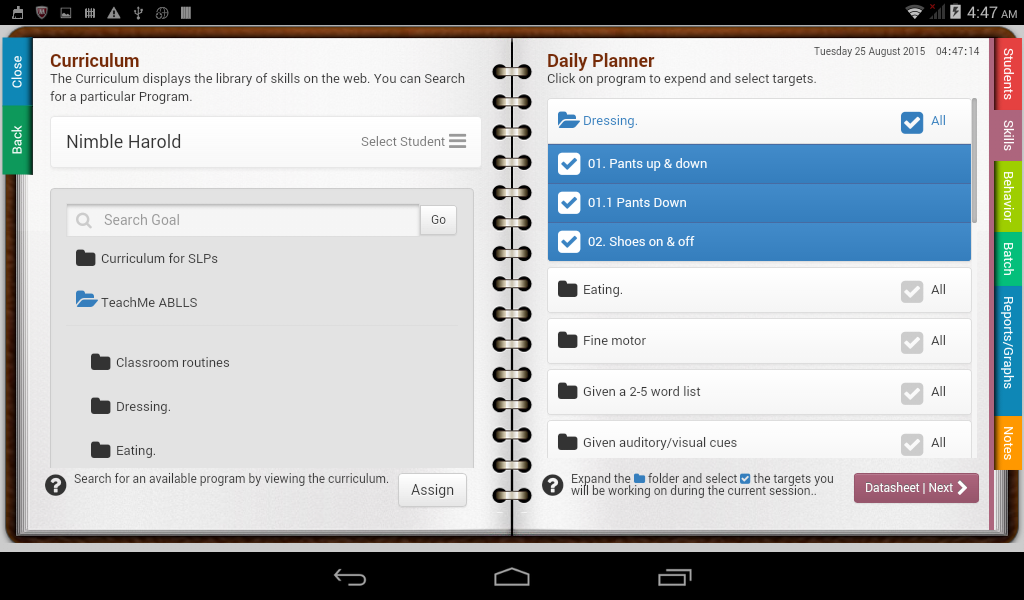 ए.बी.ए. डाटा नोटबुक - पूर्ण सुविधा, कई छात्रों के कौशल और व्यवहार प्रबंधन डेटा दोनों के लिए समवर्ती इकट्ठा करने की क्षमता प्रदान करता है। रेखांकन और रिपोर्टों डिवाइस और वेब पर दोनों हैं। प्रचालन व्यवहार, पूर्ववृत्त, परिणाम, शीघ्र स्तर, सेटिंग्स, प्रत्येक छात्र के लिए तीव्रता के स्तर को परिभाषित करते हैं। हस्तक्षेप के प्रभाव को देखें और अपने कार्य व्यवहार आकलन और व्यवहार हस्तक्षेप योजनाओं की निगरानी। वेब के साथ synched कर रहे हैं जो नए लक्ष्य और चरण बदलें लाइनें बनाने। आम मूल्यांकन उपकरण, जैसे के साथ गठबंधन के लिए एक पाठ्यक्रम का प्रयोग करें ABLLS, VB_MAPP, या अपना स्वयं का बनाएँ। विभिन्न उपकरणों के बीच शेयर डेटा और आप से दूर छोड़ दिया, जहां से एक सत्र शुरू करते हैं।