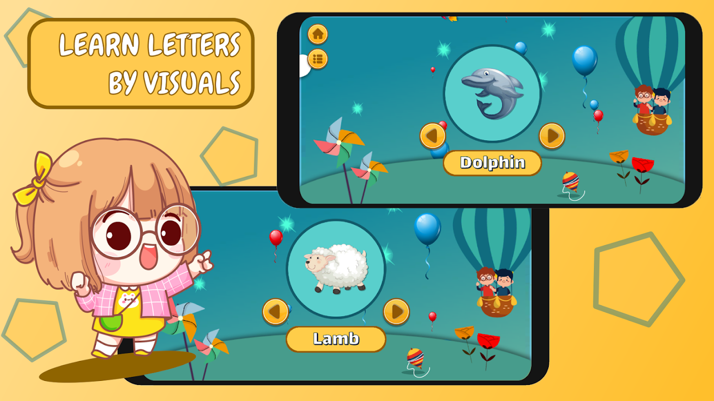 एबीसी किड्स गेम - ध्वन्यात्मकता के साथ ध्वनिकी और अनुरेखण में आकर्षक ग्राफिक्स, ध्वनियाँ और एनिमेशन हैं,
