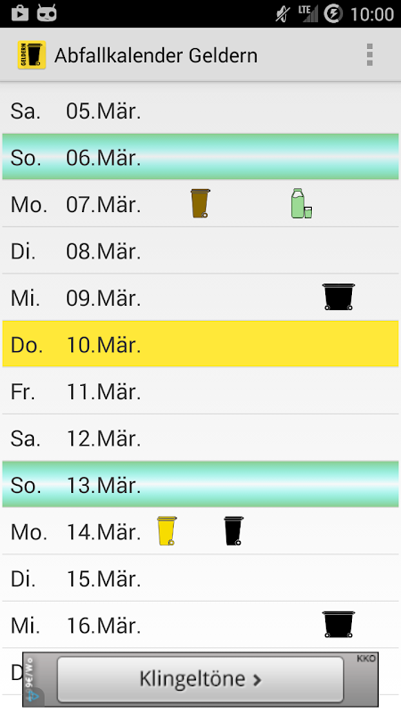 Ein einfacher Müllkalender mit den Abfuhrterminen des Stadtgebietes Geldern und Erinnerungsfunktion für die verschiedenen Müllarten.
