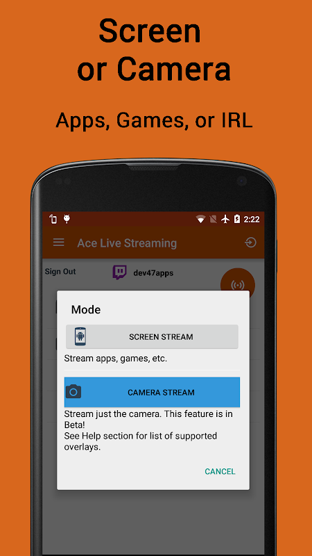 Ace Live Stream lets you live stream, or mirror to PC, your camera or entire screen.