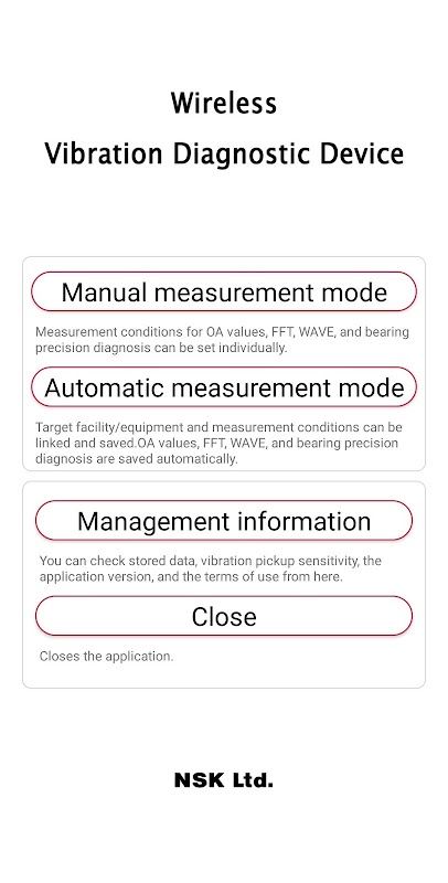 मशीनरी और उपकरणों के लिए बुनियादी कंपन मूल्यों (OA) को मापने के लिए अपने स्मार्टफोन या टैबलेट को वायरलेस तरीके से NSK के डायग्नोस्टिक डिवाइस (ब्लूटूथ® के माध्यम से) से कनेक्ट करें। हम आपकी आवश्यकताओं के अनुरूप तीन मूल्यांकन मोड प्रदान करते हैं: आवृत्ति विश्लेषण (FFT), समय तरंग विश्लेषण (WAVE), और सटीक निदान।