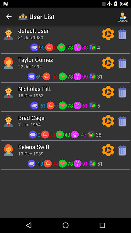 जोड़ें, संपादित और जिसके लिए Biorhythm और Biorhythm अनुकूलता की गणना करने के लिए उपयोगकर्ताओं को हटा दें।