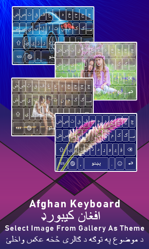 The new Afghan Pashto English Keyboard is the new way to use your default mobile keyboard with multiple colors, beautiful backgrounds, emoji keyboard for mobile and much more. This is best keyboard theme that likely compatible with android keyboard and best app to customize keyboard with new look. Download latest colorful theme keyboard with keyboard wallpaper to give change your phone look into a new way.