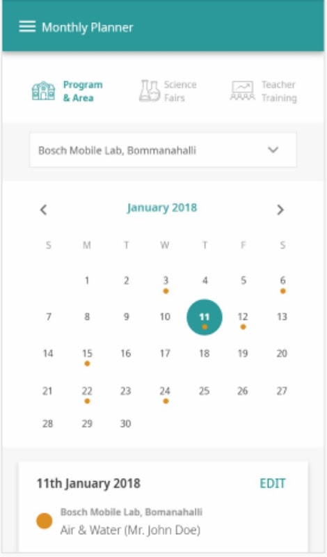 *A Planner to show the sessions, science fairs, TTP and other actvities scheduled for the month allowing the area leads to edit and add new sessions to the schedule.