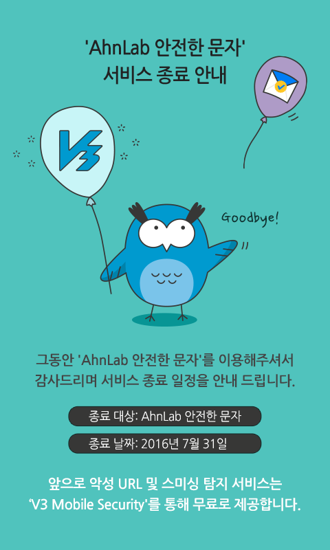 앞으로 악성URL 및 스미싱 탐지 기능은 'V3 Mobile Security' 앱을 통해 무료로 제공 해드립니다.