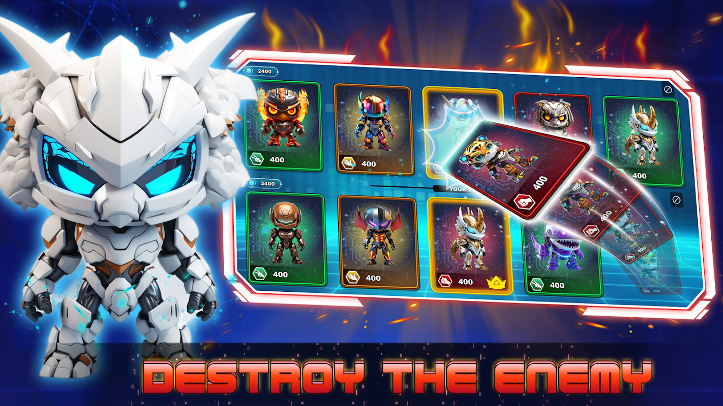 -प्रशिक्षण और विकास: अपने रोबोट को स्तर बढ़ाने और उनके कौशल में सुधार करने के लिए युद्ध में प्रशिक्षित करें। उनकी क्षमताओं को मर्ज करने और अपग्रेड करने के लिए जीत से मिलने वाले पुरस्कारों का उपयोग करें।