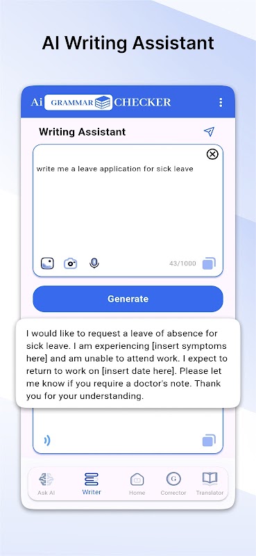 AI से पूछें: क्या आप परफेक्ट लेटर लिखने में अटके हैं या किसी अन्य लेखन कार्य में सहायता चाहिए? बस ग्रामर चेकर AI को एक संकेत दें, और यह आपके लिए तुरंत एक सटीक टेक्स्ट तैयार कर देगा। यह आपके पास एक व्यक्तिगत लेखन सहायक की तरह है!