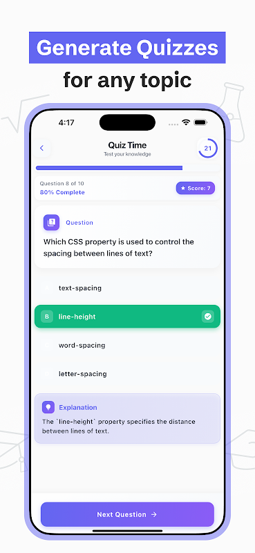 अपने ज्ञान का परीक्षण करने और परीक्षाओं की तैयारी के लिए किसी भी विषय से कस्टम क्विज़ बनाएँ।