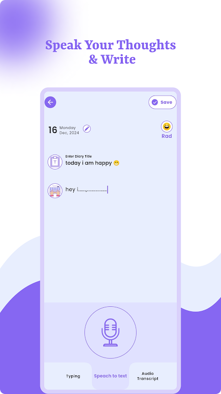 जर्नल से बात करें: हमारी स्पीच-टू-टेक्स्ट सुविधा के साथ अपने भाषण को मूल रूप से टेक्स्ट में बदलें।