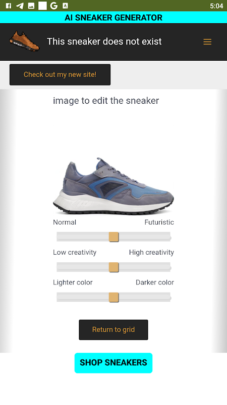 AI Sneaker Generator is a artificial intelligence app that generates sneakers. This app displays a grid of AI-generated sneakers portraits. Each sneaker is uniquely made by AI, therefore unique in it's entirety and you get to edit each sneaker the way to want with the editor tab.