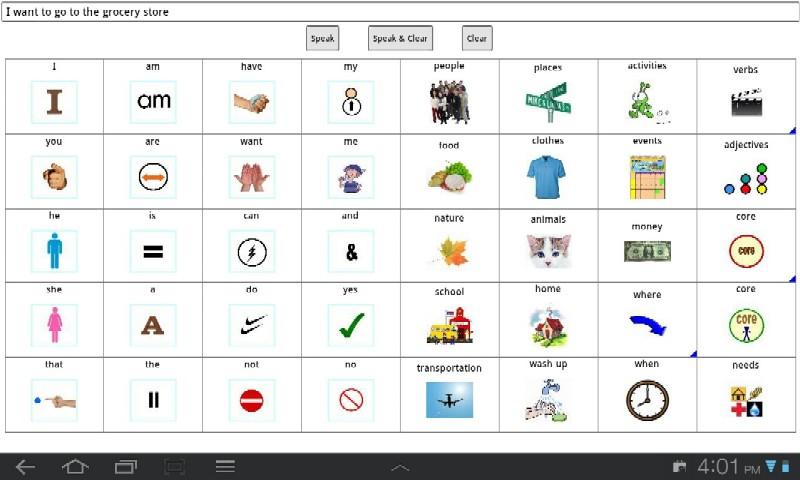 Alexicom एएसी आप एक आगम संचार उपकरण के रूप में अपने एंड्रॉयड फोन या टैबलेट का उपयोग करने देता। ChildPreA / बी, Child1A / बी, Child2, बाल इंटरमीडिएट, PicSpeechmaker, Adult1, Adult2, Speechmaker, हेल्थकेयर, और हम अपने सार्वजनिक पुस्तकालयों में 1,200 से अधिक पूर्व बनाया पृष्ठों और 7,000 से अधिक छवियों, जो बारह पूर्व बनाया पेज सेट का प्रस्ताव शामिल है स्पेनिश Child1। आप आसानी से अपने खुद के ऑनलाइन पुस्तकालय में इन पृष्ठों आयात कर सकते हैं उन्हें अनुकूलित, और / या अपने खुद के पृष्ठों को बनाने। एटी एंड टी प्राकृतिक आवाज़ें 20 आवाजों और पांच भाषाओं में पाठ से भाषण उत्पादन प्रदान करते हैं।