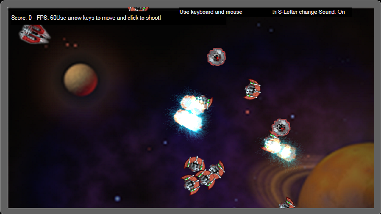 Game works with touch screen or keyboards. With s-key you get fighting, laser and explosion voice away.