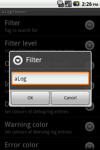 As I can't expect users to be developers I needed an easy method for users to grab the log and hopefully only the interesting part of the log. Using aLogViewer allows you to add two filter to the log. One where you specify a tag to filter for and the level of messages to let through and a level of which other messages are let through.