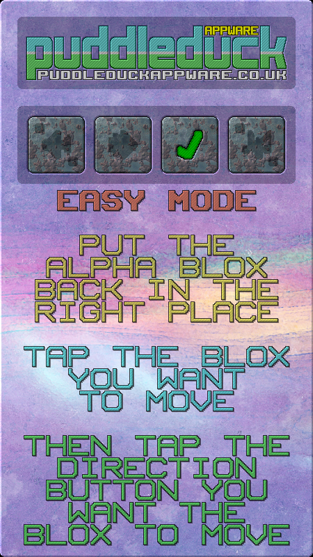 Normal mode : The traditional block slider. Blocks can only be moved into the empty space. The lower option buttons are not used in this mode, so will not appear. Simply tap the block you want to move into the empty space, and if it can, it will.