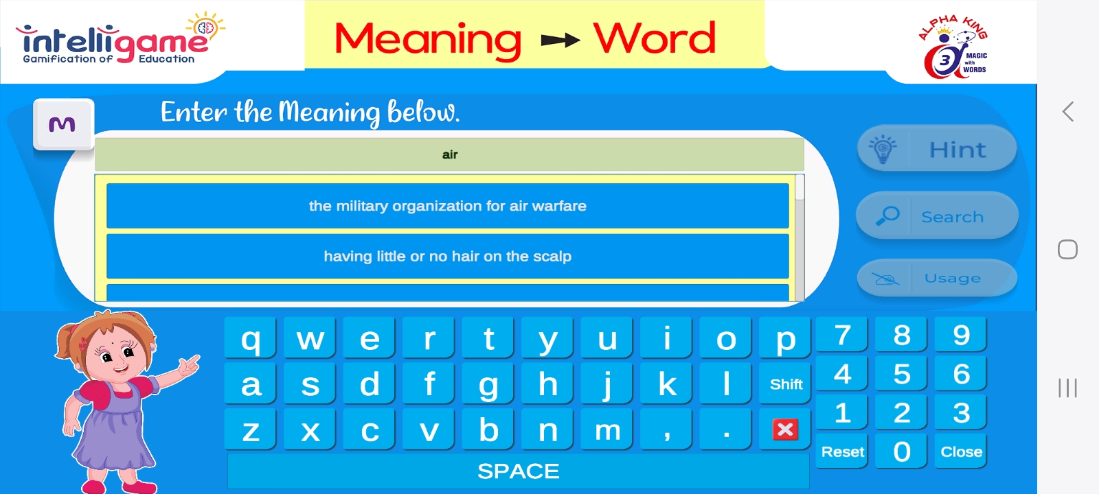 शब्द को तुरंत प्राप्त करने के बजाय, उपयोगकर्ता 'HINT' बटन पर क्लिक करके शब्द की खोज करने से पहले एक के बाद एक सुराग प्राप्त करने की चरण-दर-चरण प्रक्रिया में शब्द की खोज करना भी चुन सकता है। यह सीखने की प्रक्रिया में बहुत रोमांच जोड़ता है।