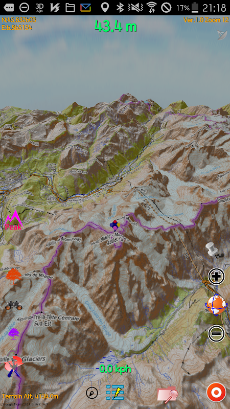 आल्प्स 3 डी मैप ट्रैकिंग, पीक पोजिशन, ऑफ़लाइन 3 डी मैप के आसपास नेविगेट करना