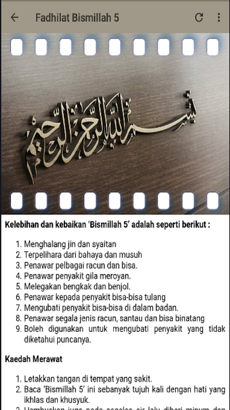 Dalam aplikasi Bismillah Lima & Khasiatnya terangkum secara mudah untuk Anda gunakan sehari hari, bismillah 5 tulisan rumi yang akan selalu terbaru dan terupdate sebagai pelengkap kajian agama Islam terutama ayat bismillah 5 tulisan rumi. Jangan sampai ketinggalan untuk mendapatkan Khasiat Bismillah Lima yang akan selalu update untuk Anda semua, tentu saja Anda tidak akan pernah rugi untuk download aplikasi DOA-DOA PELINDUNG DIRI: Keutamaan dan khasiat Bismillah ini!! Tunggu apa lagi, segera download sekarang juga.