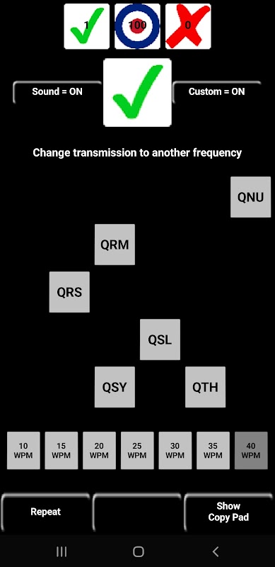 ध्वनि चालू करें और ऐप मोर्स कोड में क्यू-सिग्नल चलाएगा और साथ ही उनकी परिभाषाओं को प्रदर्शित करेगा। आपका काम नीचे कीपैड से मेल खाने वाले क्यू-कोड को टैप करना है। मोर्स कोड रिपोर्ट को समाप्त करने के लिए ध्वनि बंद करें और केवल क्यू-कोड परिभाषाओं का उपयोग करें। क्यू-कोड परिभाषा को चालू/बंद करने के लिए टैप करें और केवल मोर्स कोड सुनें।