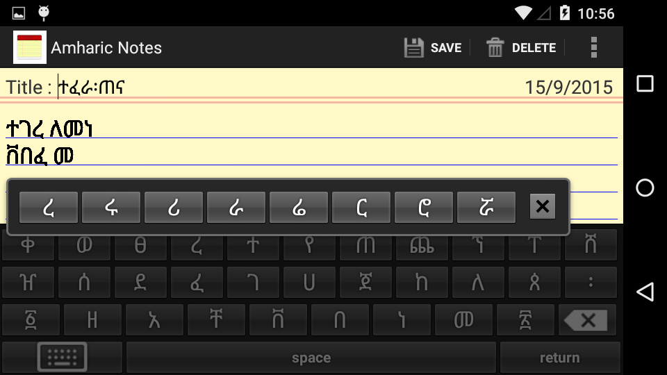 Just touch the Amahric Feedel (Alphabet) for 1 second to type or 2 seconds to choose between all the different variations of the Feedel in Amharic Notes. Taking notes in Amharic, the official language of Ethiopia, has never been easier. With our custom Keyboard you can type 90% of the Amharic Alphabet and Numbers and Punctuations too. Beautifully laid out, easy to use and very intuitive. Choose whether to save or discard your note. Easily keep track of your reminders, notes or todo list in Amharic. Available for the first time on Android. For Free. So tell all your friends and remember to rate us in the Google Play Store.