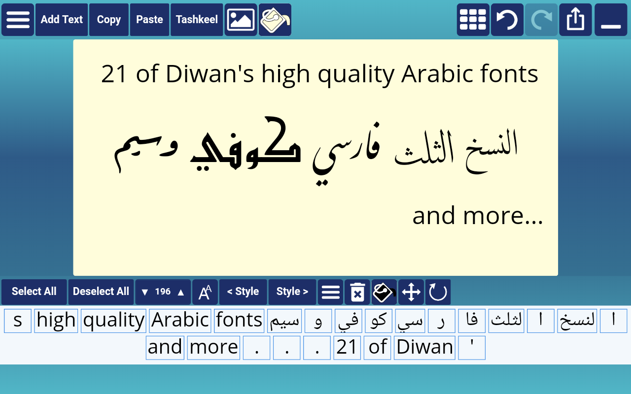 - दीवान के सबसे उन्नत अरबी फ़ॉन्ट जैसे दीवान नस्ख मिशाफी, दीवान थुलुथ, दीवान फ़ारसी, वसीम (रुक़ा जैसा फ़ॉन्ट), कुफ़ी, और बहुत कुछ सहित 21 फ़ॉन्ट के संग्रह में से चुनें।