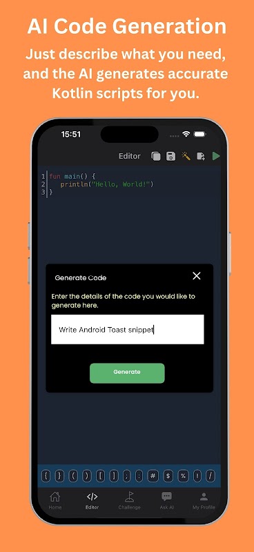 एआई कोड जनरेशन: विशिष्ट कोड लिखने में परेशानी हो रही है? बस एआई से पूछें, और यह आपके लिए सटीक एंड्रॉइड कोड उत्पन्न करेगा। चाहे आपको कोटलिन लूप की आवश्यकता हो या पूर्ण-विशेषताओं वाले एंड्रॉइड ऐप घटक की, एआई ने आपको कवर किया है।