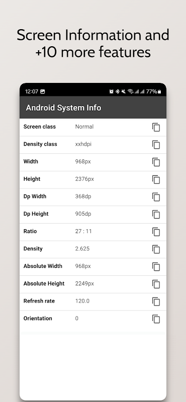 स्क्रीन जानकारी जैसे वर्ग, घनत्व, चौड़ाई, ऊंचाई, डीपी चौड़ाई/ऊंचाई, अनुपात, घनत्व, ताज़ा दर।