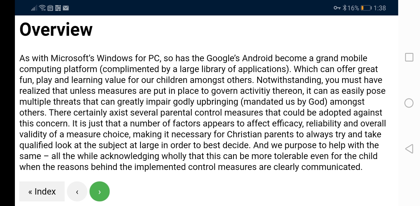 पुस्तक का उद्देश्य ईसाई माता-पिता को एंड्रॉइड से संबंधित माता-पिता के नियंत्रण पर एक योग्य नज़र डालने में मदद करना है। मानक एकल-ऐप अभिभावक नियंत्रण दृष्टिकोण के विकल्प तलाशना - जैसे रूट आधारित दृष्टिकोण और सहायक। जो उन मामलों के लिए विशेष रूप से उपयोगी हो सकता है जहां आपको वर्तमान में लागू कोई भी उपाय अपर्याप्त या बस अप्रभावी लग सकता है।