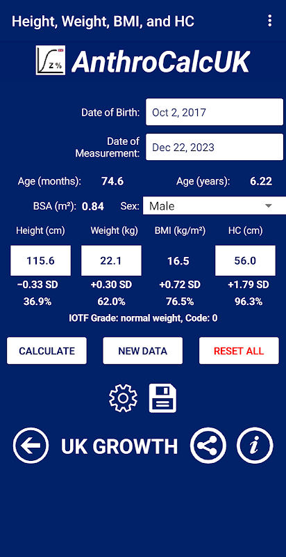 एंथ्रोकैल्कुक ऐप लंबाई/ऊंचाई, वजन, बॉडी-मास इंडेक्स (बीएमआई), सिर की परिधि, बैठने की ऊंचाई, पैर की लंबाई, कमर की परिधि, प्रतिशत शरीर में वसा के लिए प्रतिशत और जेड-स्कोर की गणना करने के लिए ब्रिटिश 1990 ग्रोथ रेफरेंस और एलएमएस विधि का उपयोग करता है। , और आमतौर पर बढ़ते बच्चों और जन्म से लेकर 23 वर्ष तक के युवाओं के लिए रक्तचाप; और 23 से 42 सप्ताह के गर्भ में जन्म लेने वाले समय से पहले जन्मे शिशुओं की लंबाई, वजन और सिर की परिधि के लिए। गणना के लिए उपयोग की जाने वाली प्रत्येक संदर्भ सीमा के लिए उद्धरण प्रदान किए गए हैं। लंबाई/ऊंचाई, वजन, बीएमआई और सिर की परिधि के लिए रोगी-विशिष्ट डेटा को बाद में पुनर्प्राप्ति और साझा करने के लिए डिवाइस पर संग्रहीत किया जा सकता है।