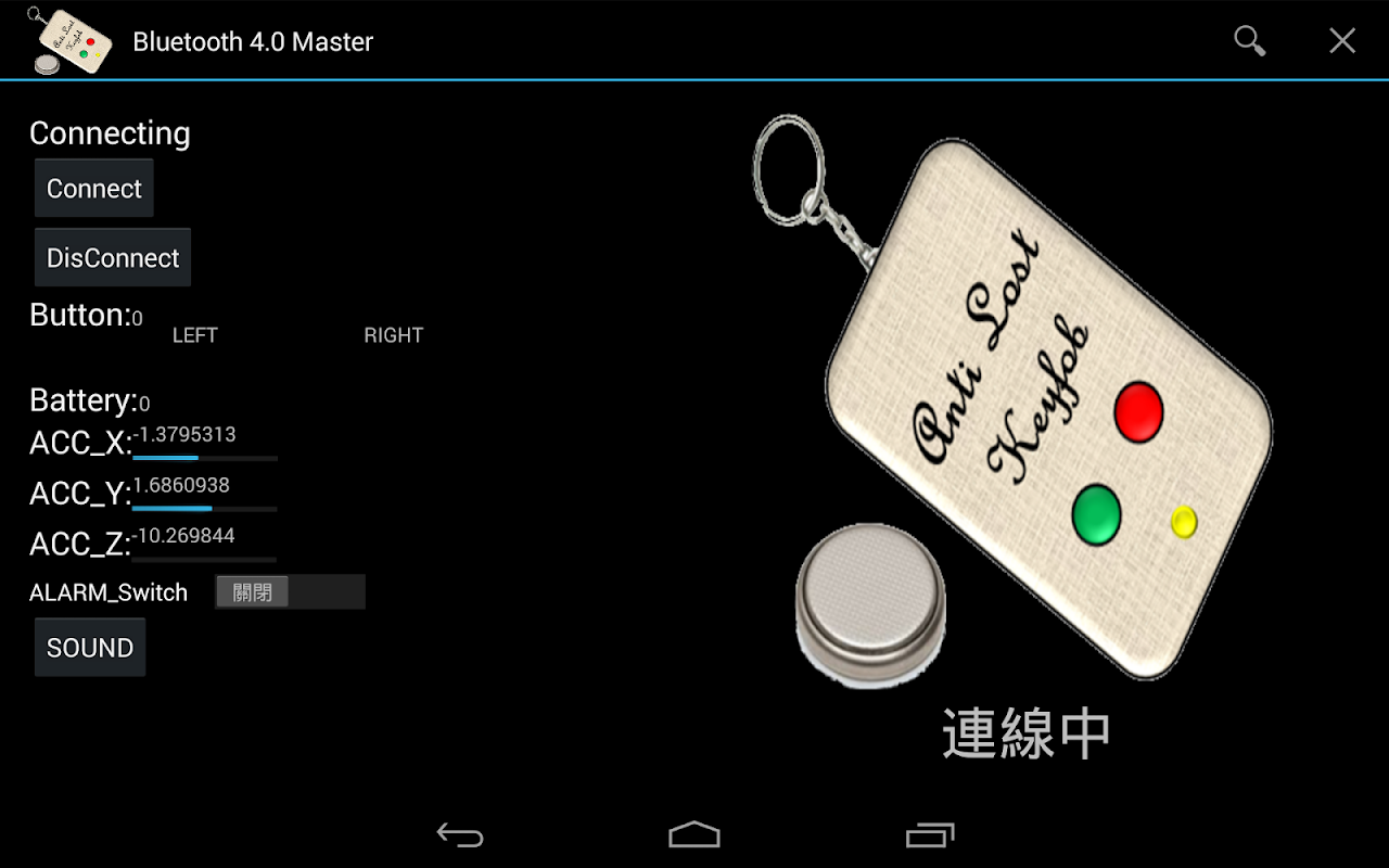 如果連接的藍芽4.0 BLE裝置有遺失或發生震動,則本APP會發出警示音樂,藍芽4.0 BLE裝置也會Alarm。
