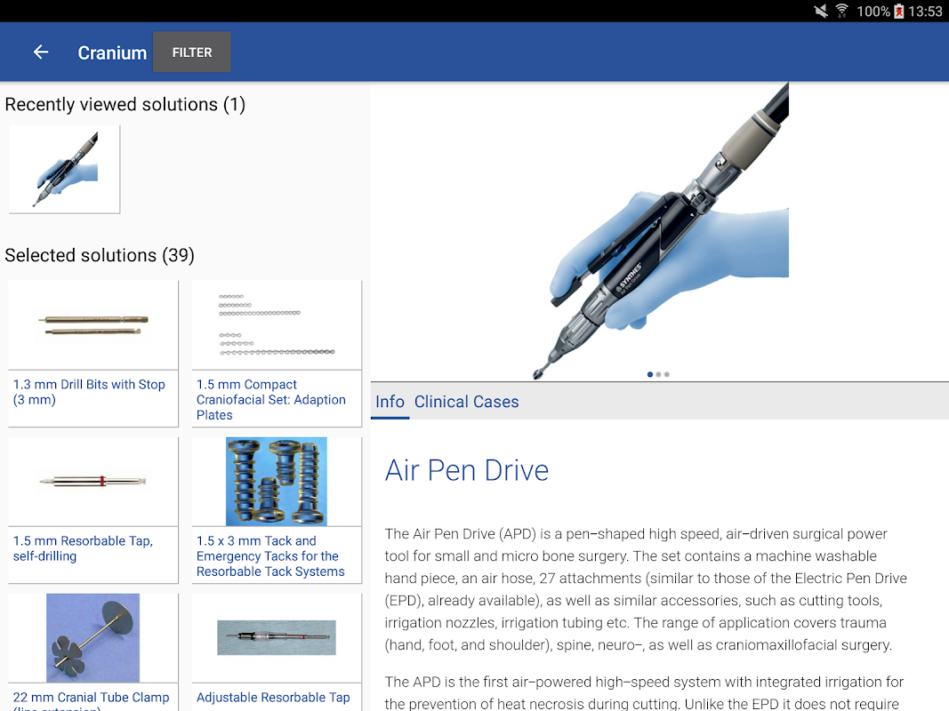 The AO TC Approved Solutions App is an information tool for healthcare professionals and engineers interested in new surgical solutions in the clinical areas of Trauma, CMF, Spine, Veterinary and Neurosurgery. It allows users to browse surgical products and technologies that have been approved by the AO TC System.