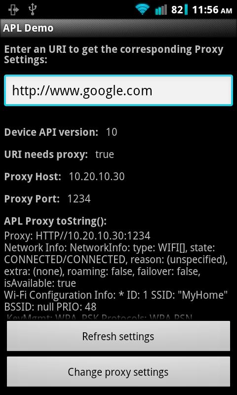This is a simple demo application that shows what developers can do using Android Proxy Library (APL), that provides an abstraction layer to easily get the proxy settings from an Android device, in order to find a better and easy solution to the Android's Issue 1273 for both developers and users. Since it has been clarified from Google's spokesman that the versions 1.x-2.x won't receive an official proxy support, APL allows to abstract the device version and easily get the proxy settings on every released Android device. You can find more informations at the following link:
