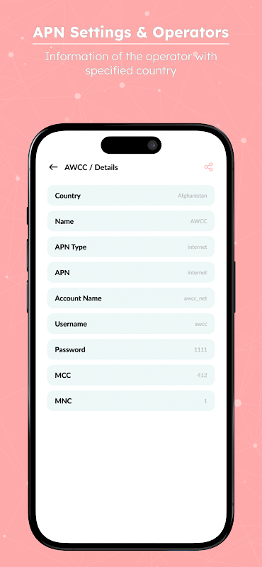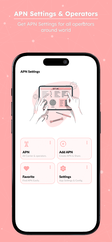 एपीएन सेटिंग्स ऐप दुनिया भर में मोबाइल वाहक और ऑपरेटरों के लिए एक्सेस प्वाइंट नेम्स (एपीएन) का एक व्यापक संग्रह प्रदान करता है। 2जी, 3जी और 4जी नेटवर्क के साथ संगत होने के लिए डिज़ाइन किए गए इस ऐप में लगभग सभी ऑपरेटरों के लिए एपीएन सेटिंग्स शामिल हैं। प्रत्येक एपीएन प्रविष्टि में वाहक नाम, एपीएन नाम, एमसीसी कोड, एमएनसी कोड और इंटरनेट, एमएमएस और डब्ल्यूएपी जैसे उपयोग प्रकार जैसे आवश्यक विवरण शामिल हैं।