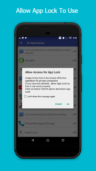 Note: For android 5.0+, allow Applock to use usage access permission -> Find AppLock -> Allow usage access