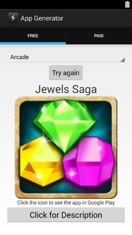 Tired of dealing with the same apps everyday with little to no diversity? Application Suggester is the solution! Application Suggester is a simple and easy-to-use application that takes in a category and randomly generates an application from Google Play within the category specified for the user to consider trying. This application is perfect for anyone who wants to try new applications but doesn't know how to begin searching for them, ESPECIALLY FOR GAMES! It's as simple as selecting one of the nearly 50 categories that interests you and then let the application do the rest! The application displays the selected application's name, icon, and description. If any application interests you, just click on the generated icon and you will be redirected to Google Play to download it. You can generate as many different apps as you want any number of times.