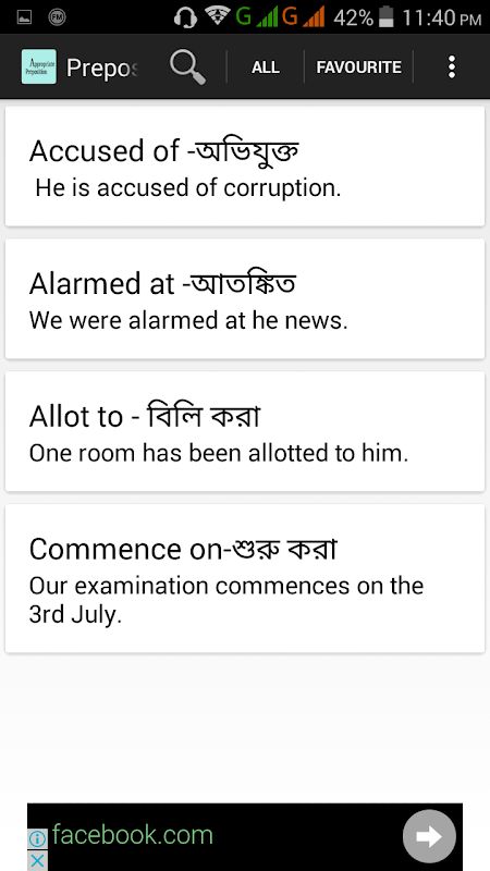 এই এপ্লিকেশনটিতে প্রত্যেকটা Appropriate Preposition এর সাথে তার বাংলা অর্থ দেওয়া আছে।প্রত্যেকটি Appropriate Preposition এর সাহায্যে ব্যাকরচনা করে এর প্রয়োগ দেখানো হয়েছে।